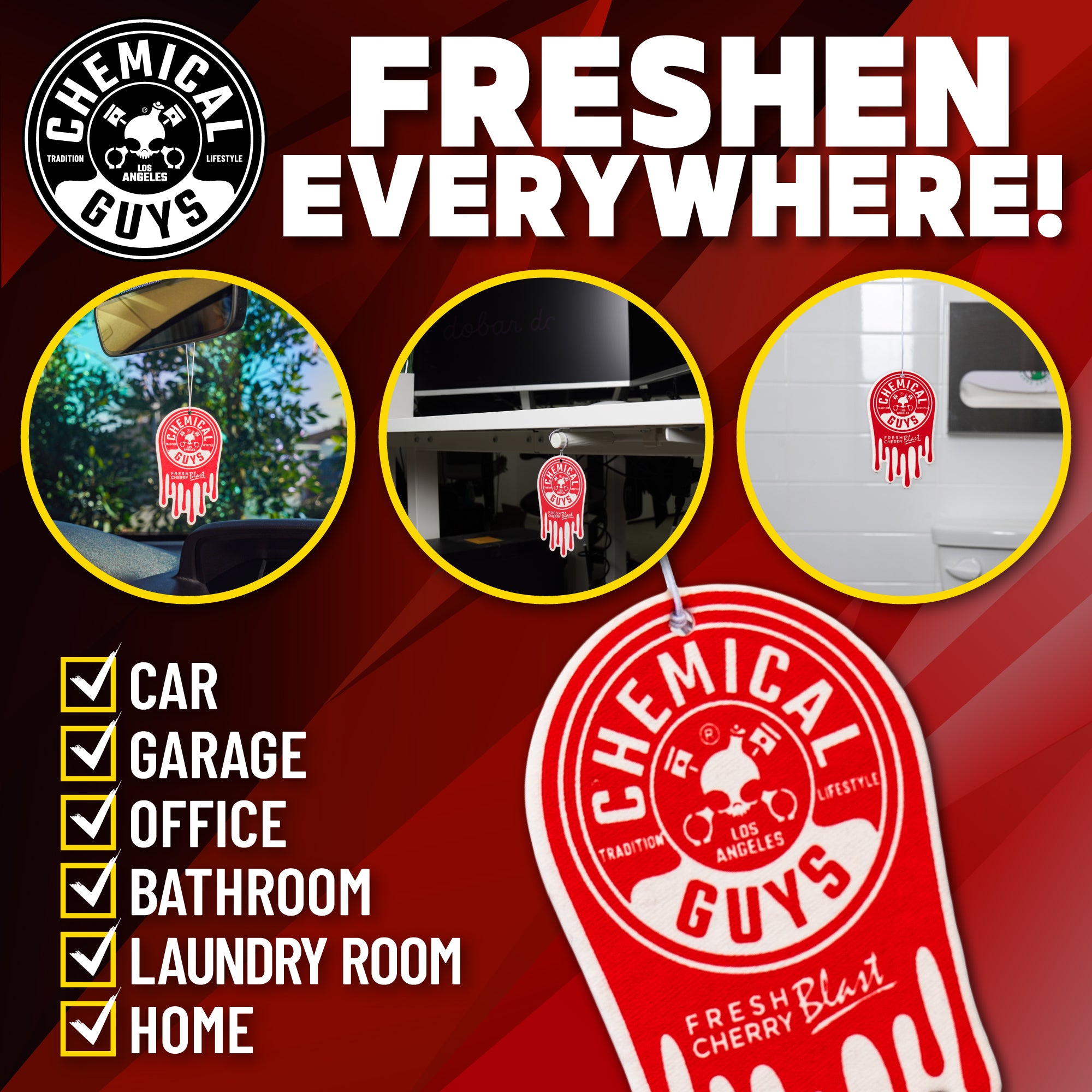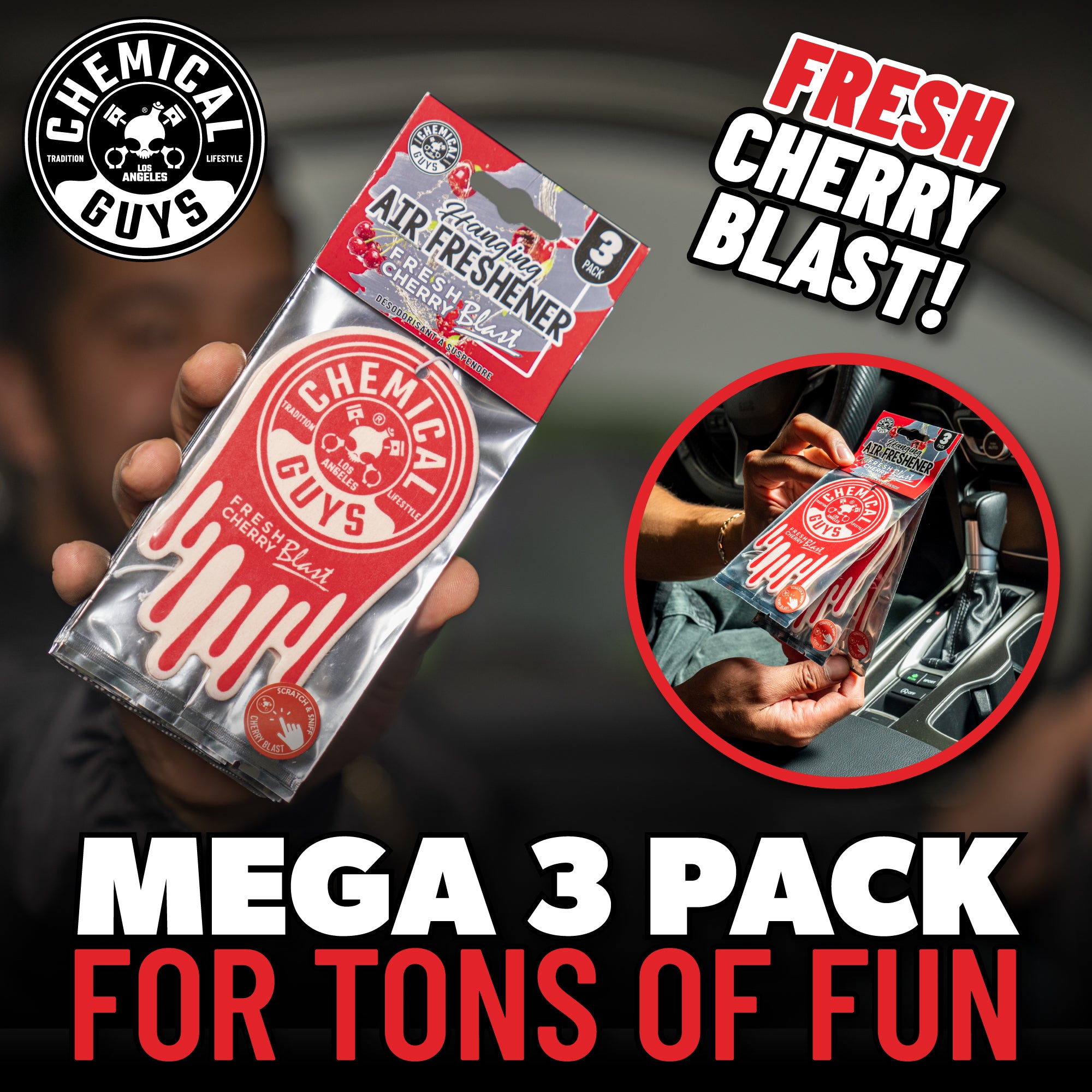 Turn every drive into a delightful journey with our Fresh Cherry Blast Hanging Air Freshener 3-Pack. Embrace the sweet and tangy aroma of ripe cherries that instantly refresh your car interior. Whether commuting to work or embarking on a road trip. let the deep and indulgent scent uplift your mood and create a pleasant driving atmosphere.?
