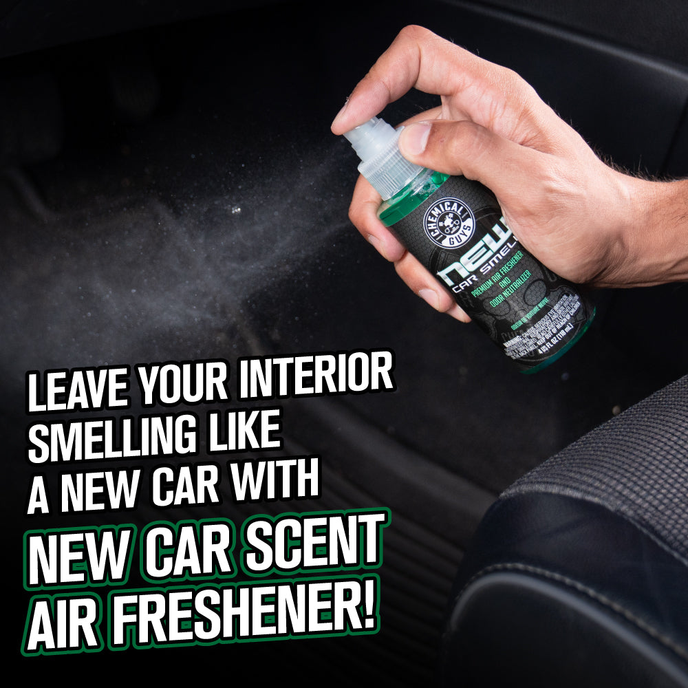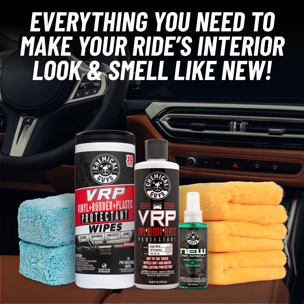 This kit is the easy way to revitalize your ride’s interior and leave it looking and smelling like new! Restore. protect. and shine trim. dashboards. and door panels with VRP. while New Car Smell Air Freshener lets you enjoy that fresh-off-the-lot scent with just a spray.?